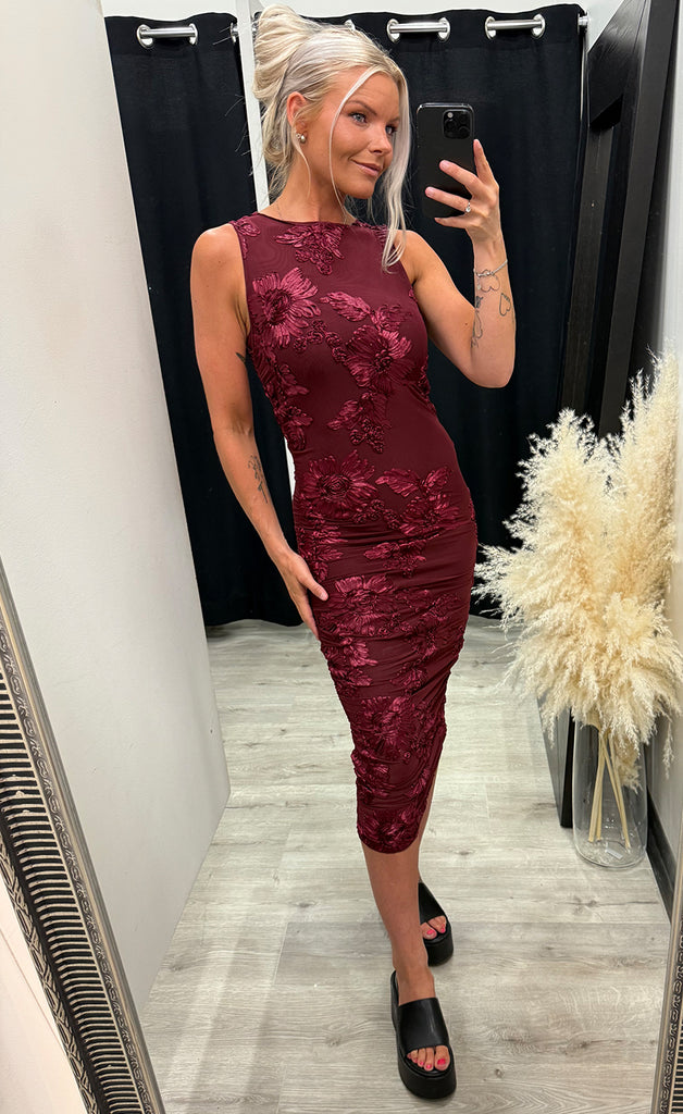 Kjóllinn er úr teygjanlegu mesh efni og fóðraður.