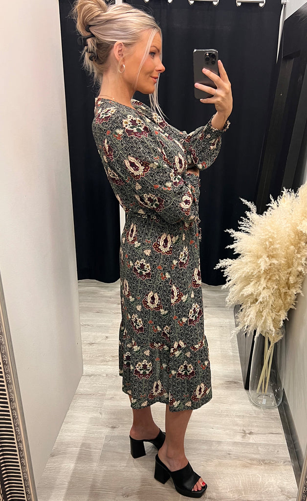 Kjóllinn er úr léttu efni, hnepptur að ofan og með rykkingu í mittið.