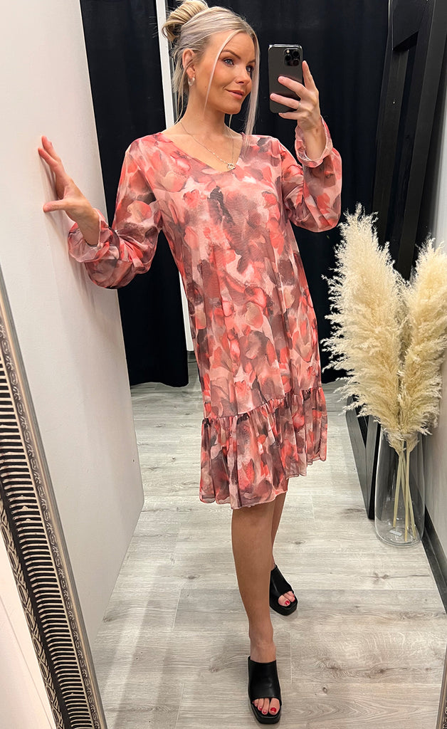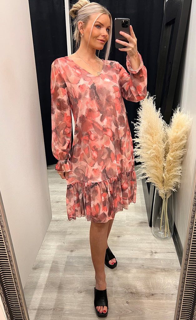 Ótrúlega flottur v-neck kjóll úr teygjanlegu mesh efni. Kjóllinn er með teygju framan á ermum og pífu að neðan. -Módel er 168 cm á hæð Ein stærð = ca. 42-46