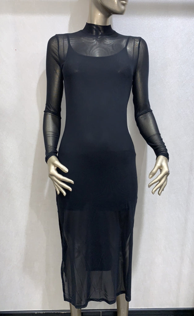 Ótrúlega flottur kjóll úr teygjanlegu mesh efni. Kjóllinn er með háum kraga, klauf í hliðum og undirkjól. -Módel notar stærð 36/38 og er 168 cm á hæð og er í stærð S
