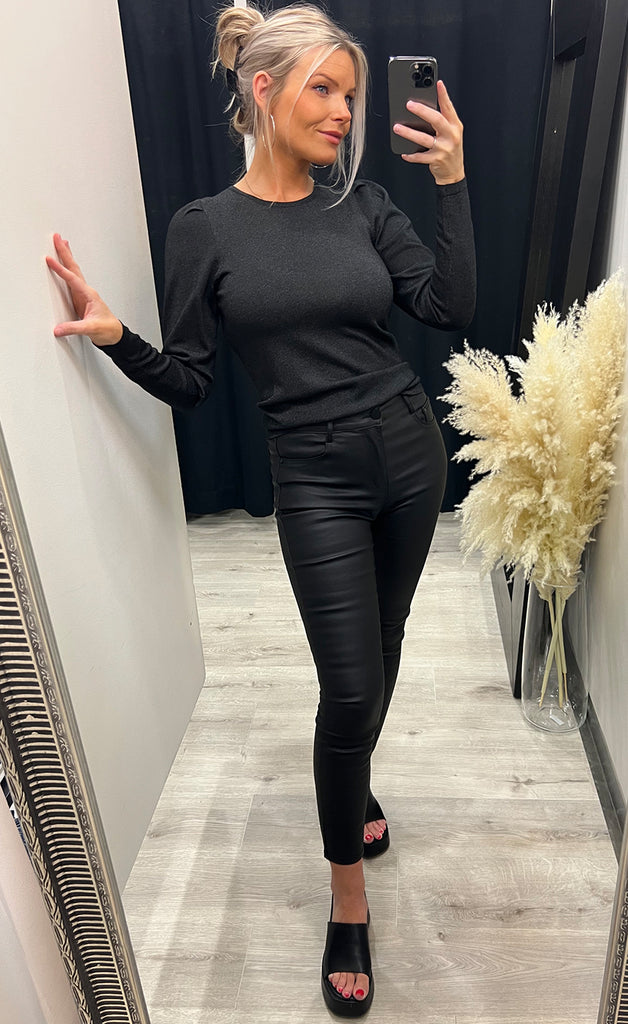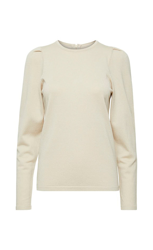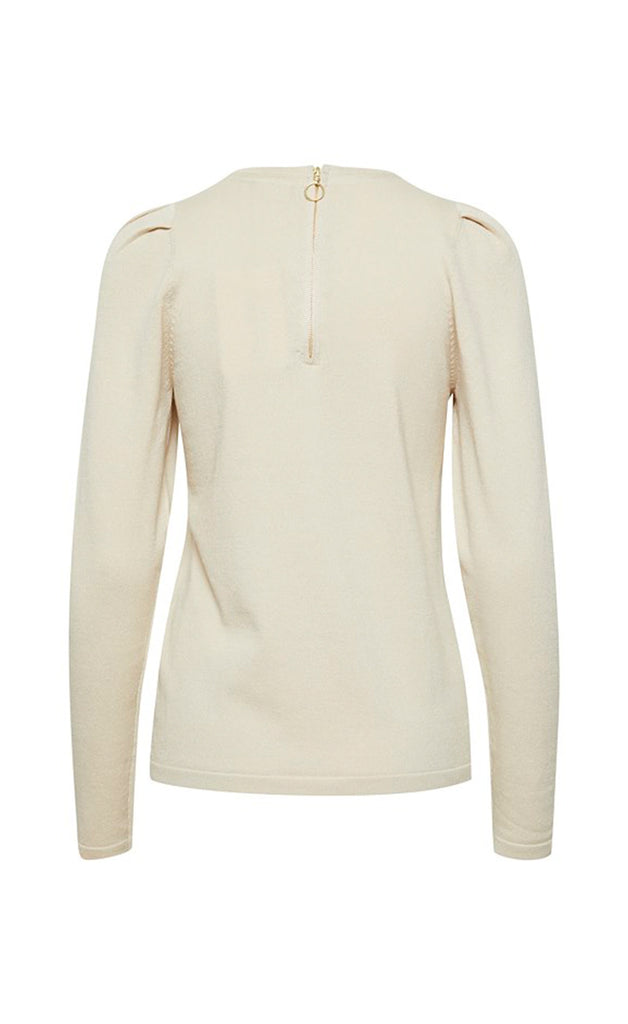 Peysan er úr mjúku og teygjanlegu efni, með rykktu detail á öxlum og rennd í bakið.