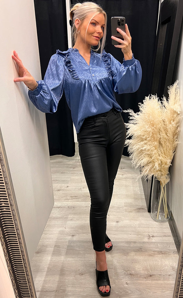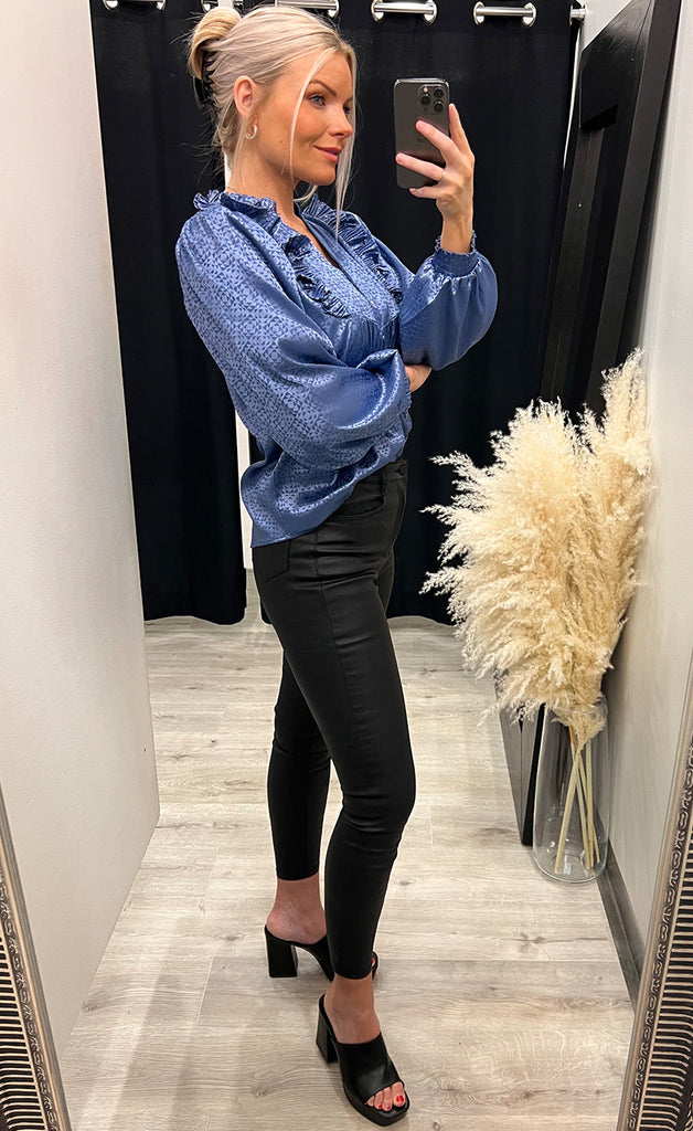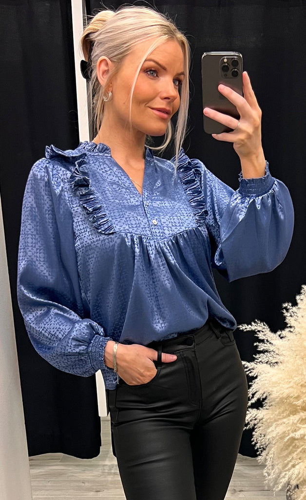 Blússan er úr flottu satín efni, hneppt að ofan og með flottu pífu detail.