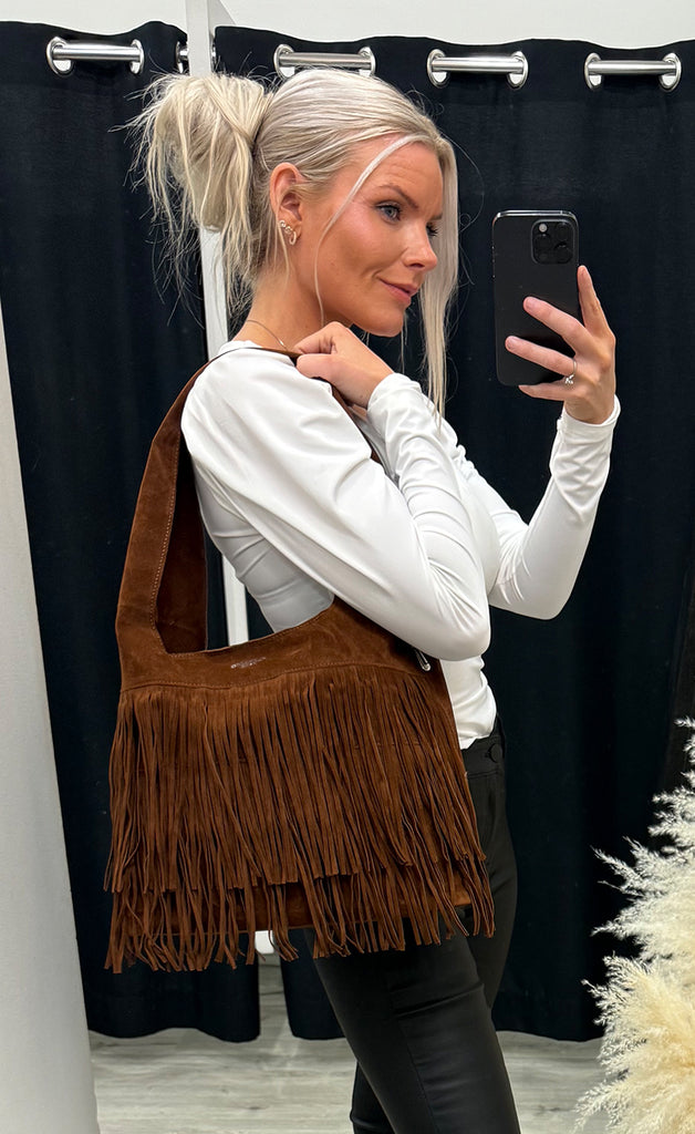 Taskan er með einu stóru hólfi og flottu kögri að utan.