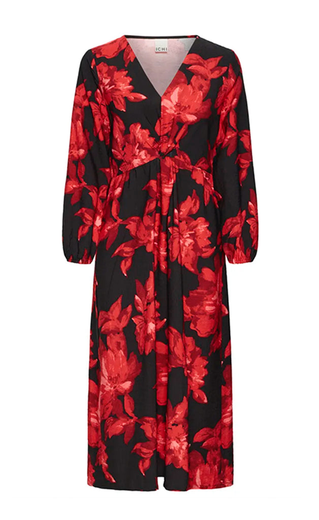 Ótrúlega fallegur kjóll frá danska merkinu ICHI. Kjóllinn er úr léttu efni og með teygju í mittið í bakið. -Módel notar stærð 36/38 og er 168 cm á hæð og er í stærð 36