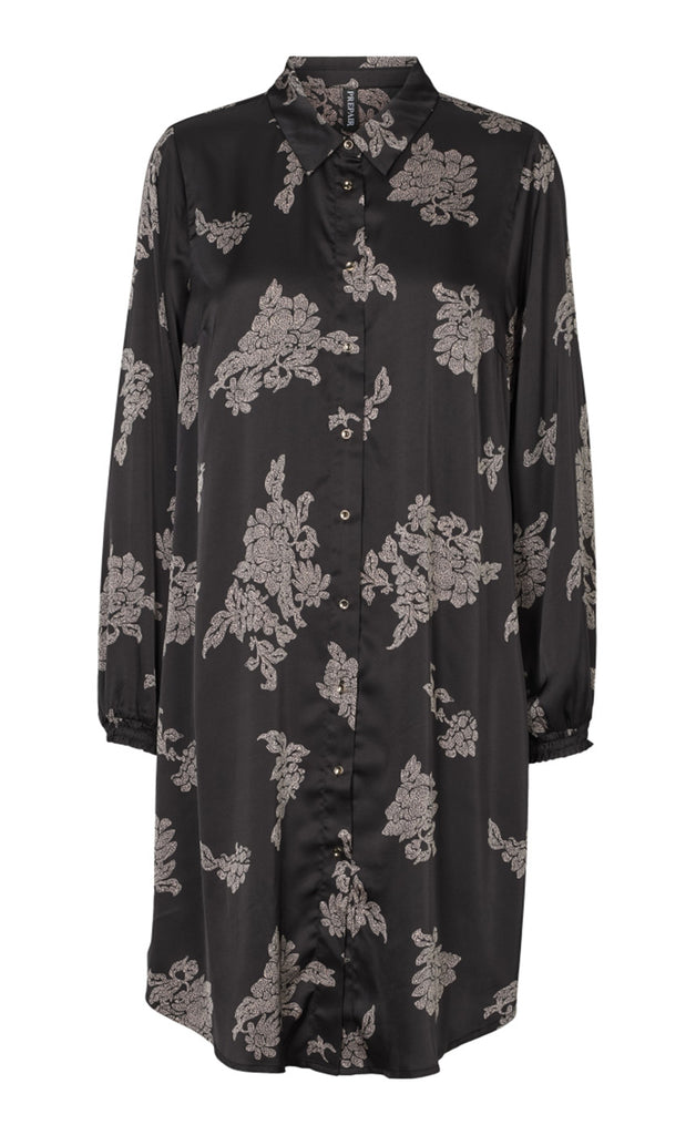 Kjóllinn er úr flottu satín efni, með kraga, hnepptur niður og með vösum.