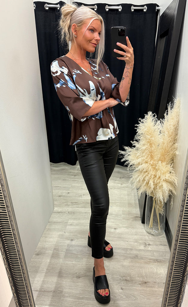 Ótrúlega falleg blússa frá danska merkinu Love&Divine. Blússan er úr flottu satín efni, með v-hálsmáli og kvartermum. -Módel notar stærð 36/38 og er 168 cm á hæð og er í stærð XS