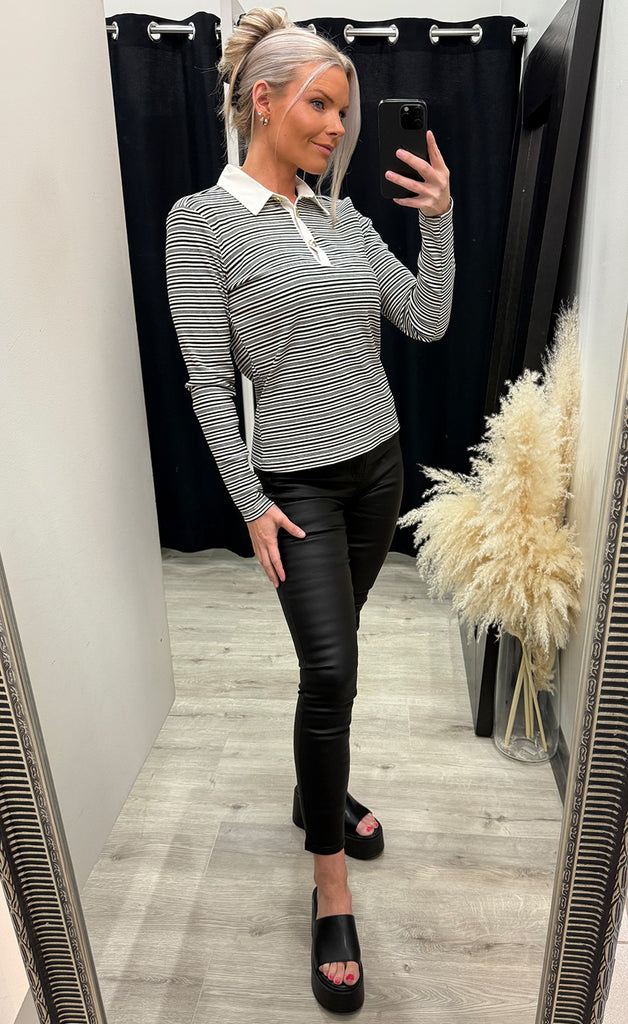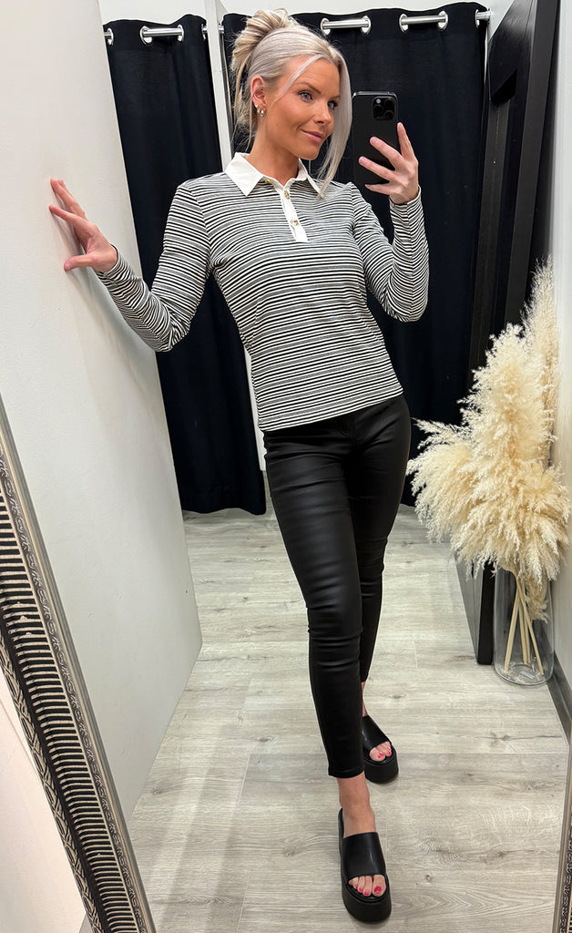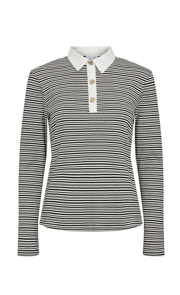 Peysan er úr mjúku og teygjanlegu efni, með kraga og hneppt að ofan með gylltum tölum.