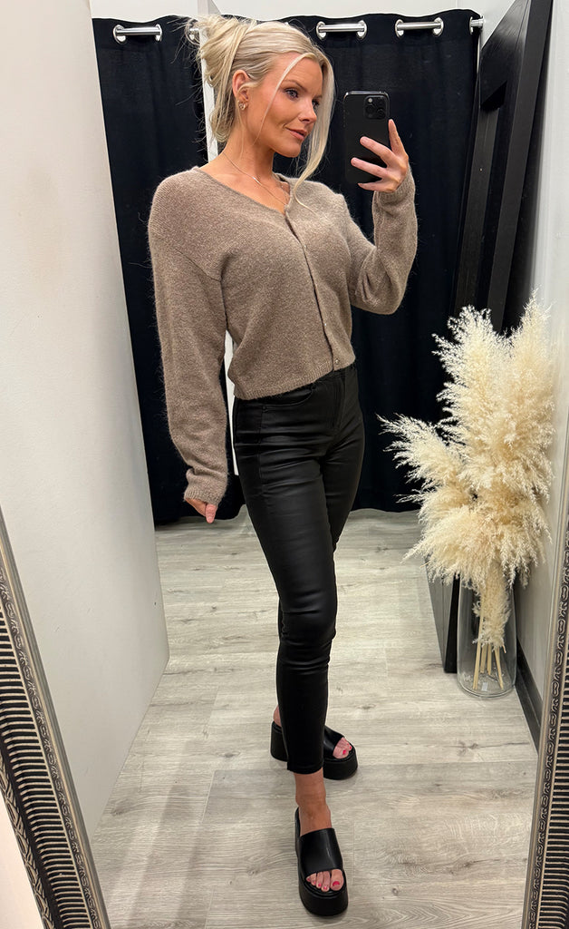 Peysan er úr mjúku og teygjanlegu efni og hneppt niður.