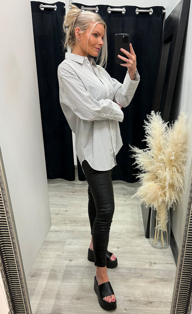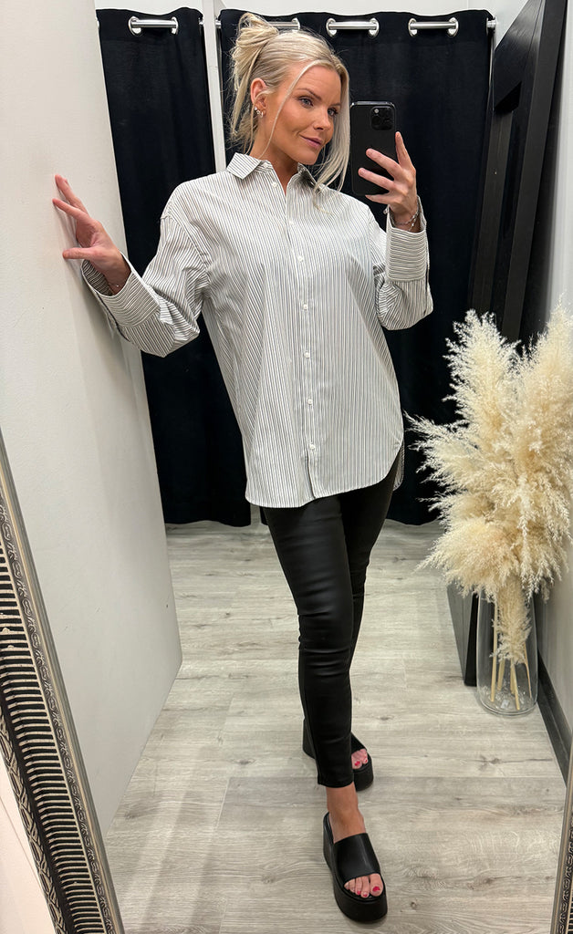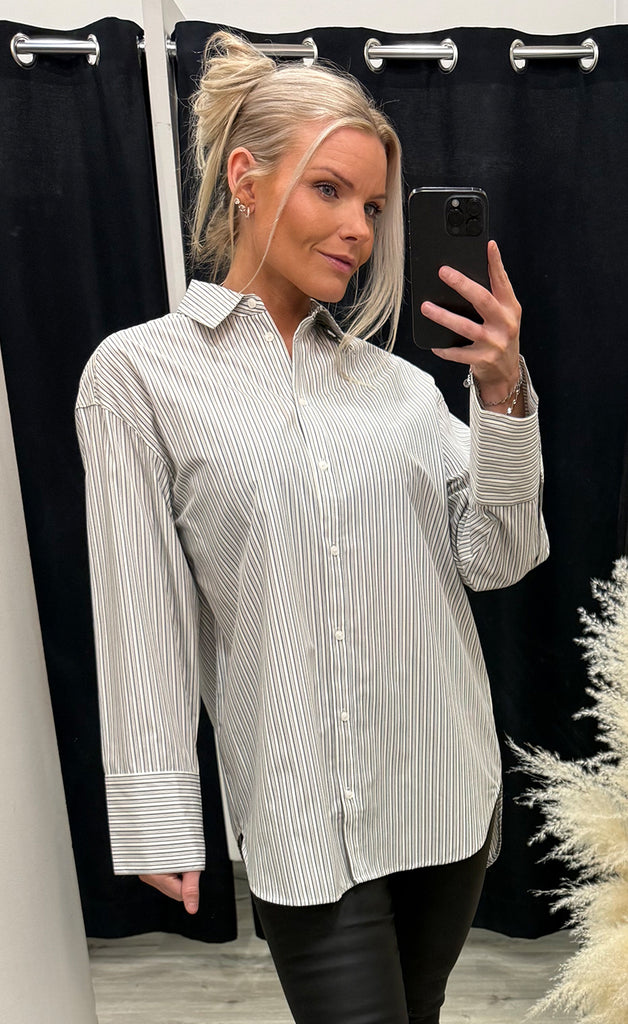 Ótrúlega flott skyrta frá danska merkinu Moss Copenhagen. Skyrtan er með kraga, hneppt niður og oversized í sniði. -Módel notar stærð 36/38 og er 168 cm á hæð og er í stærð XS/S