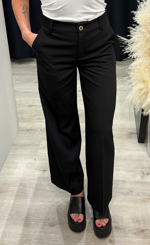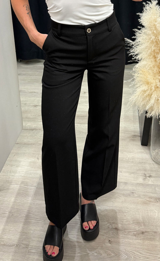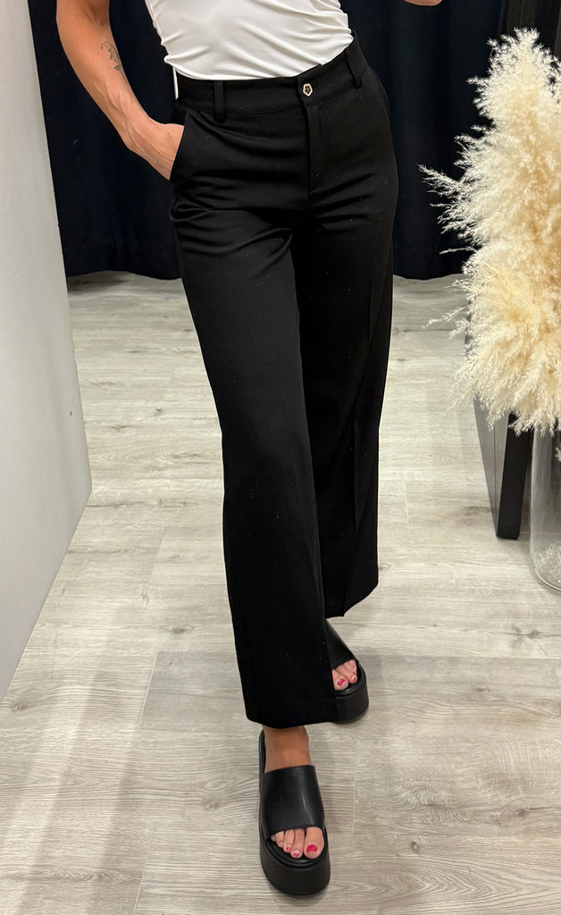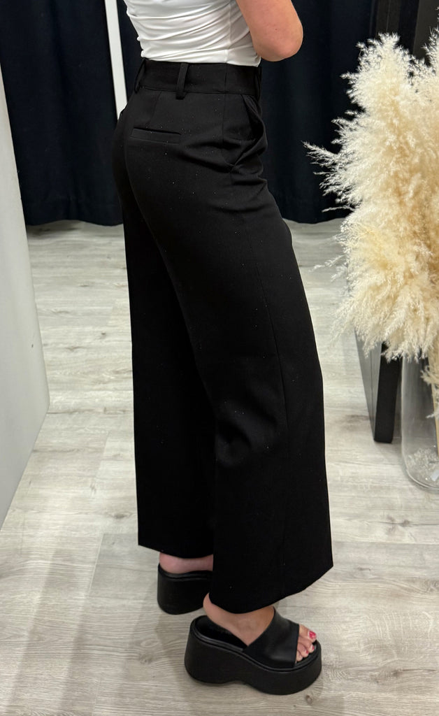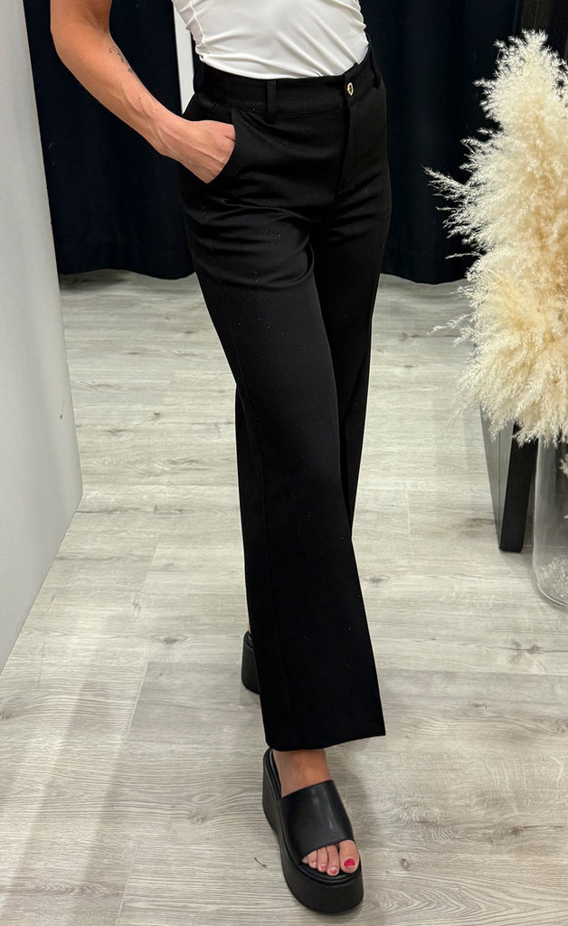Ótrúlega flottar buxur frá danska merkinu Love&Divine. Buxurnar eru með svörtum lurex glansþræði og víðar niður. -Módel notar stærð 36/38 og er 168 cm á hæð og er í stærð XS