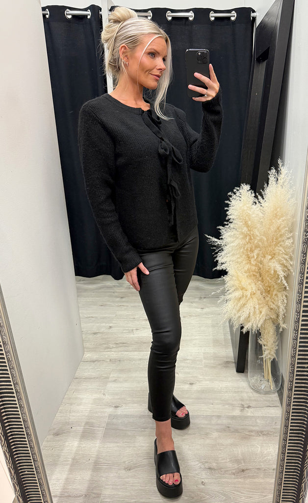 Peysan er úr mjúku og teygjanlegu efni og bundin að framan.
