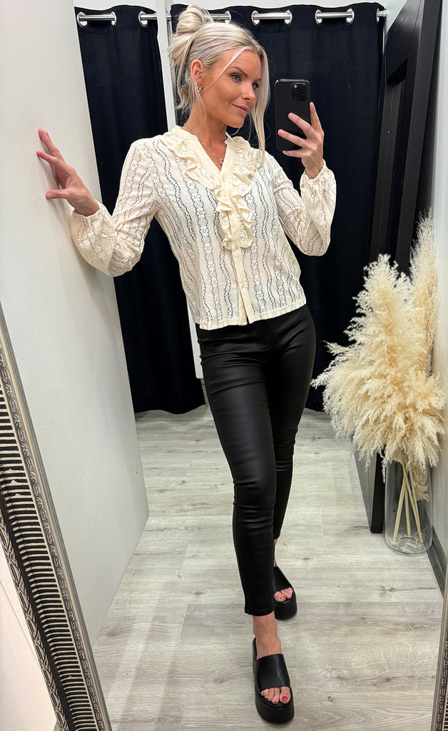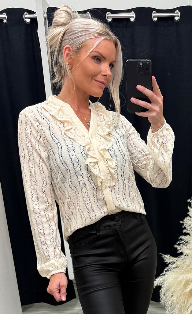 Blússan er úr teygjanlegu blúndu efni, hneppt niður og með pífum að framan.