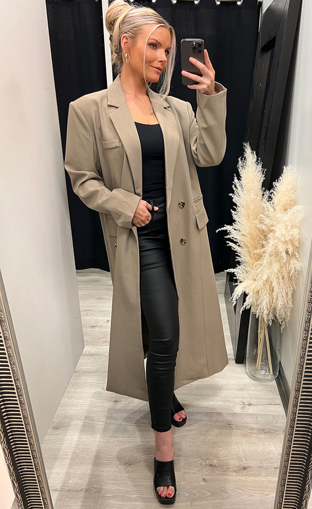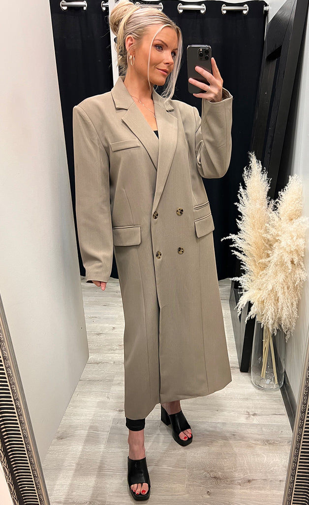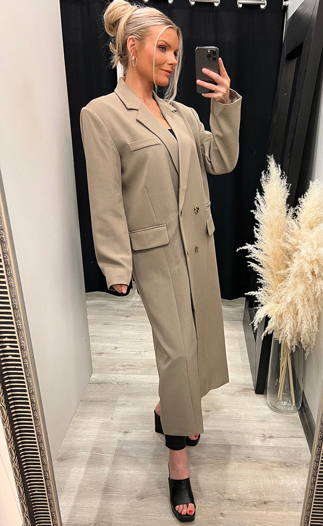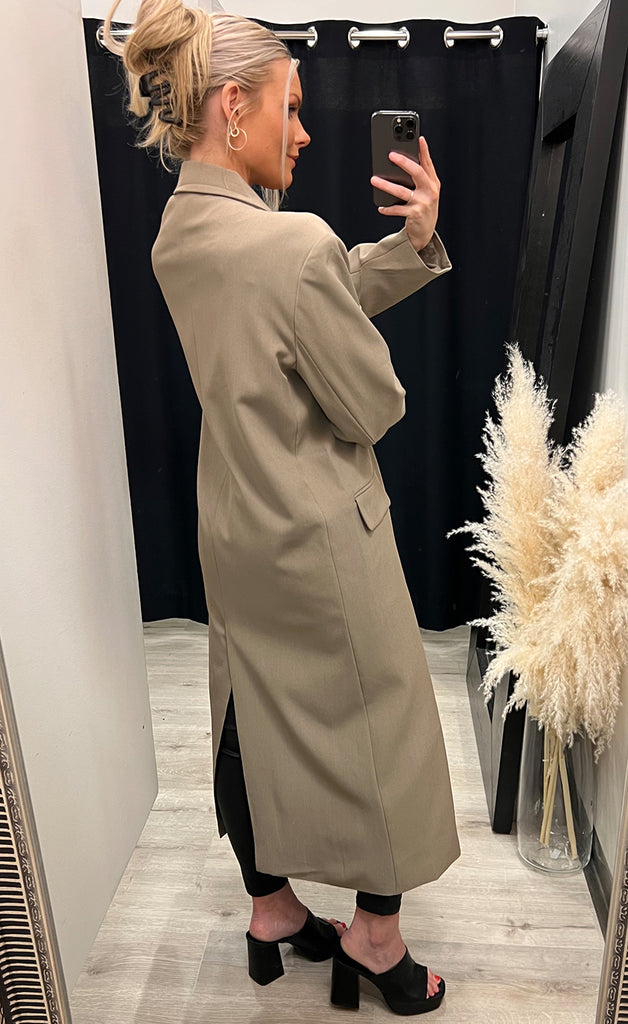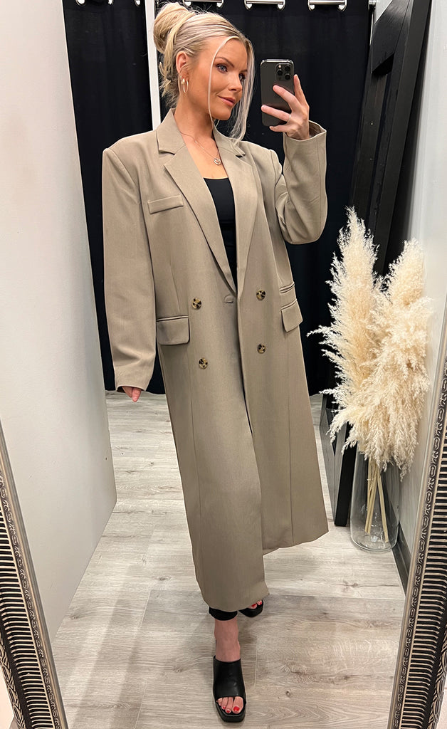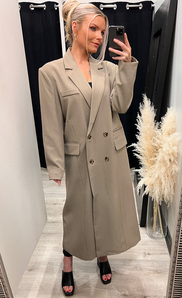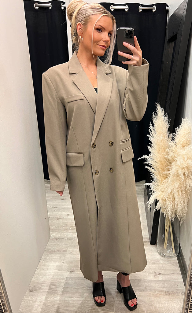 Kápan er víð í sniði, með kraga, hneppt niður og fóðruð.