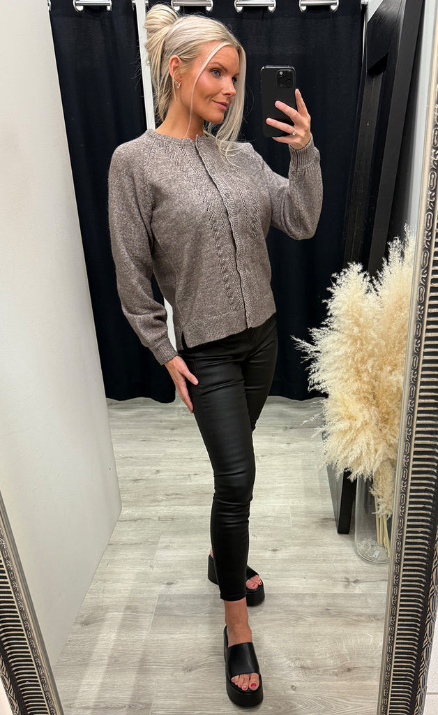 Peysan er úr mjúku og teygjanlegu efni og hneppt niður.
