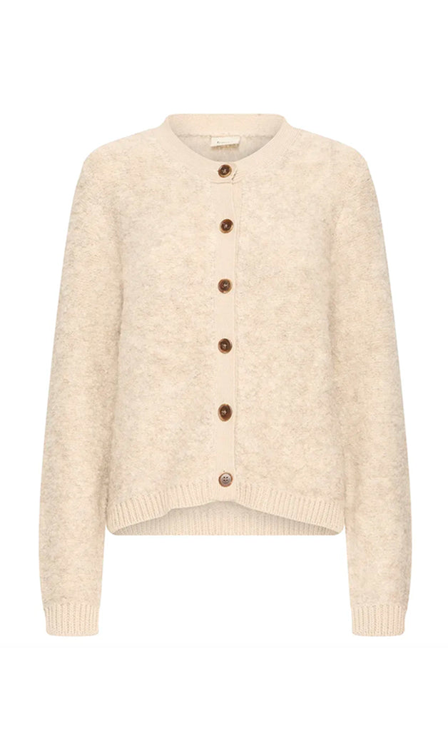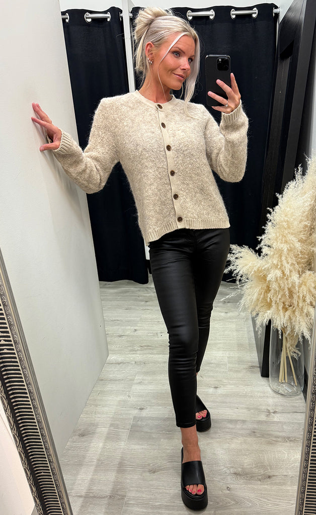 Peysan er úr mjúku og teygjanlegu efni og hneppt niður.