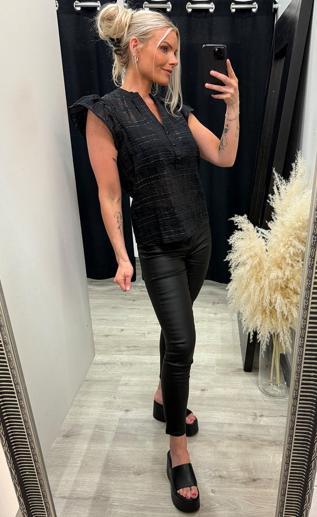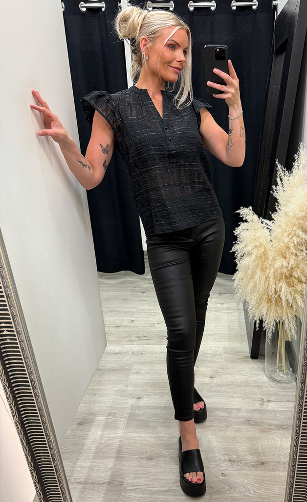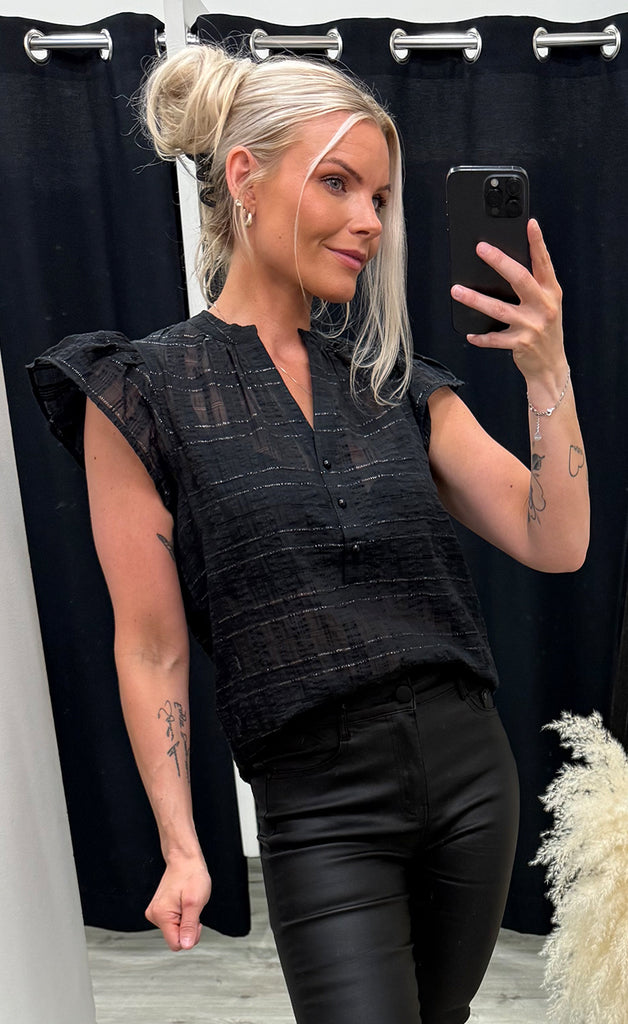 Blússan er úr léttu efni og með gylltum lurex glansþræði.