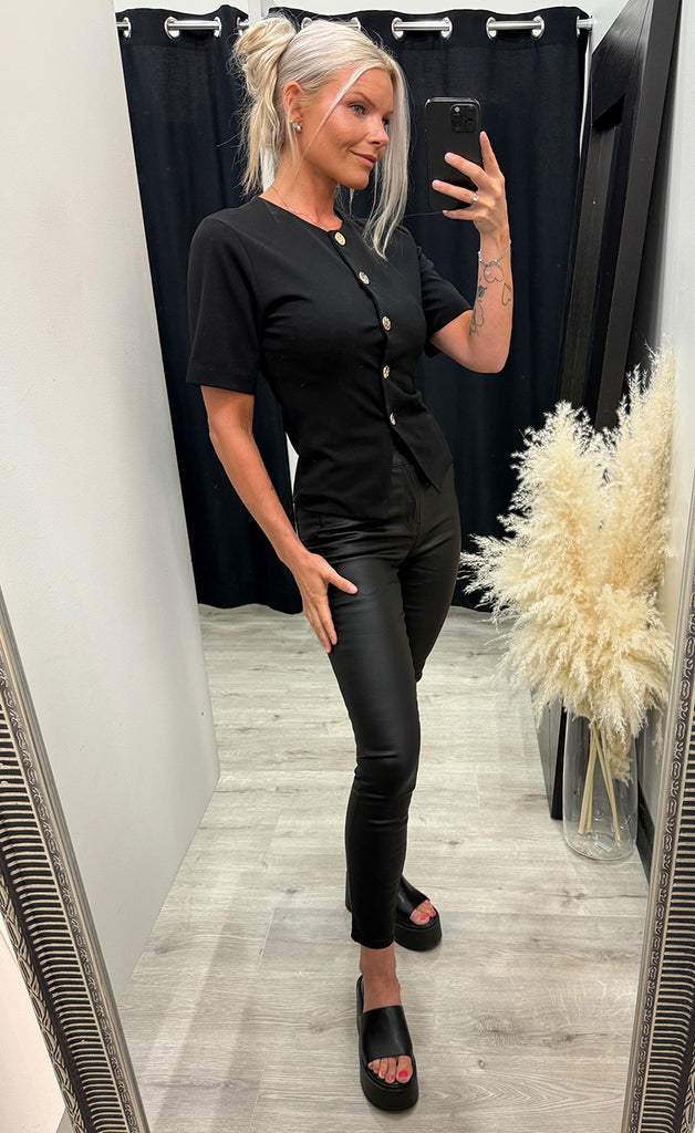 Ótrúlega flottur toppur frá danska merkinu Sisters Point. Toppurinn er úr mjúku og teygjanlegu efni og hneppt niður. -Módel notar stærð 36/38 og er 168 cm á hæð og er í stærð XS