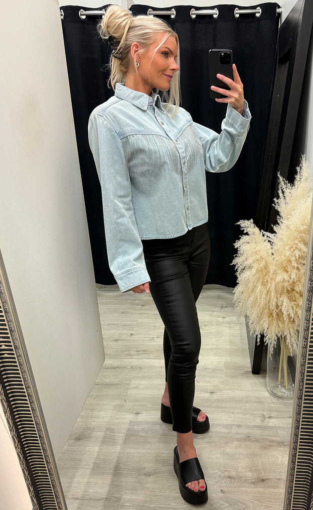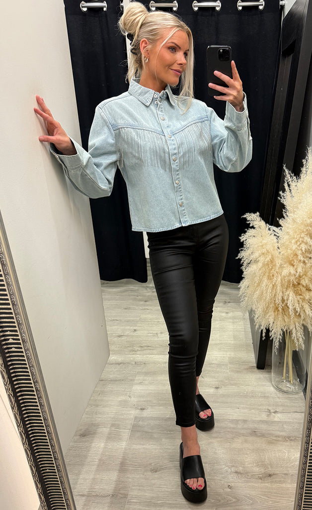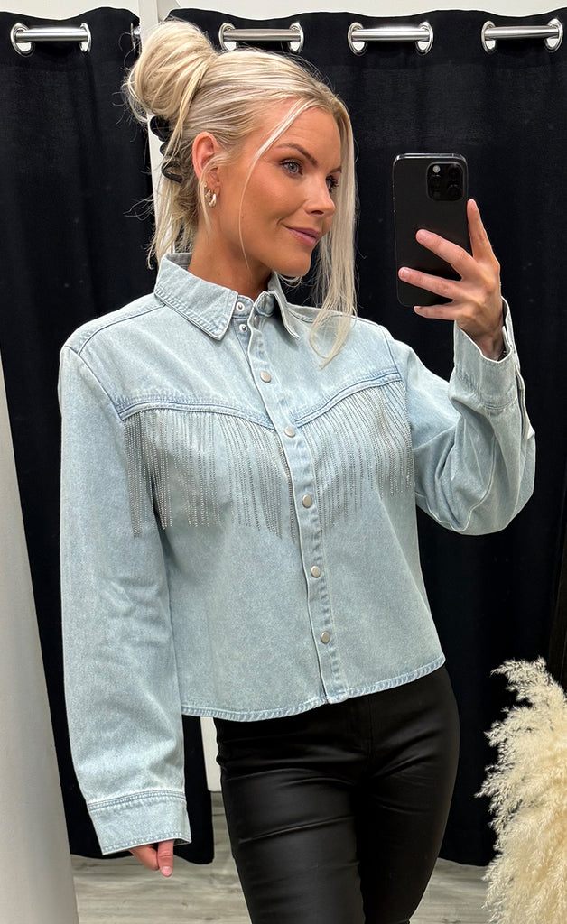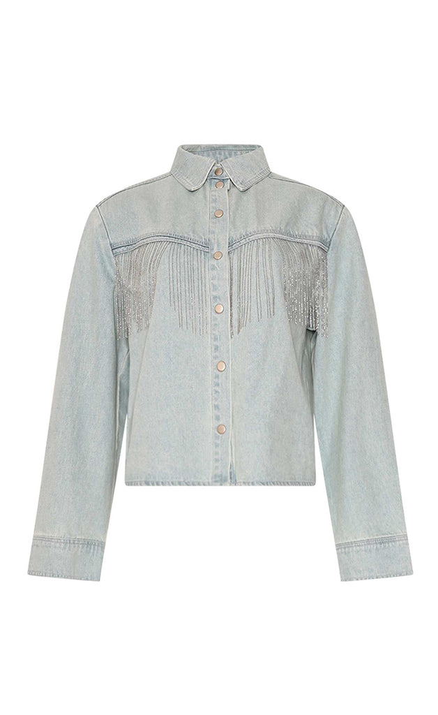 Ótrúlega falleg skyrta frá danska merkinu Noella. Skyrtan er með kraga, lokuð niður með smellum og með flottu silfur kögri að framan. -Módel notar stærð 36/38 og er 168 cm á hæð og er í stærð XS
