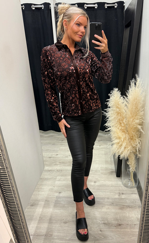 Ótrúlega falleg pallíettu skyrta frá danska merkinu Nümph. Skyrtan er með kraga, hneppt niður og úr mjúku velour efni. -Módel notar stærð 36/38 og er 168 cm á hæð og er í stærð XS