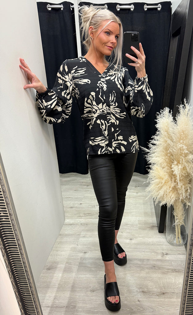Blússan er úr léttu efni, laus í sniði og með v-hálsmáli.