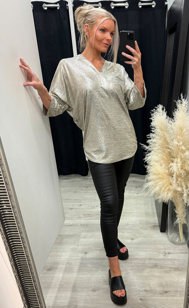 Bolurinn er með v-hálsmáli og rykktur í hliðum að neðan.