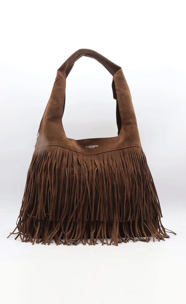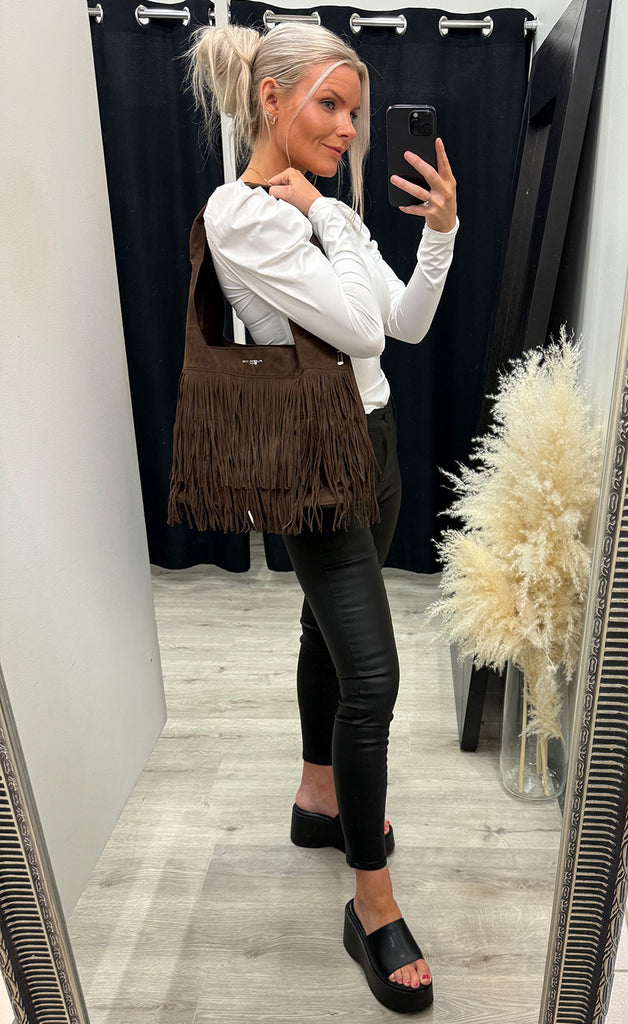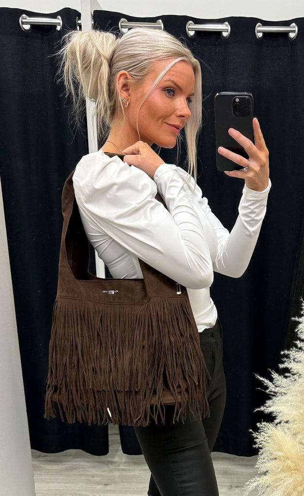 Taskan er með einu stóru hólfi og flottu kögri að utan.