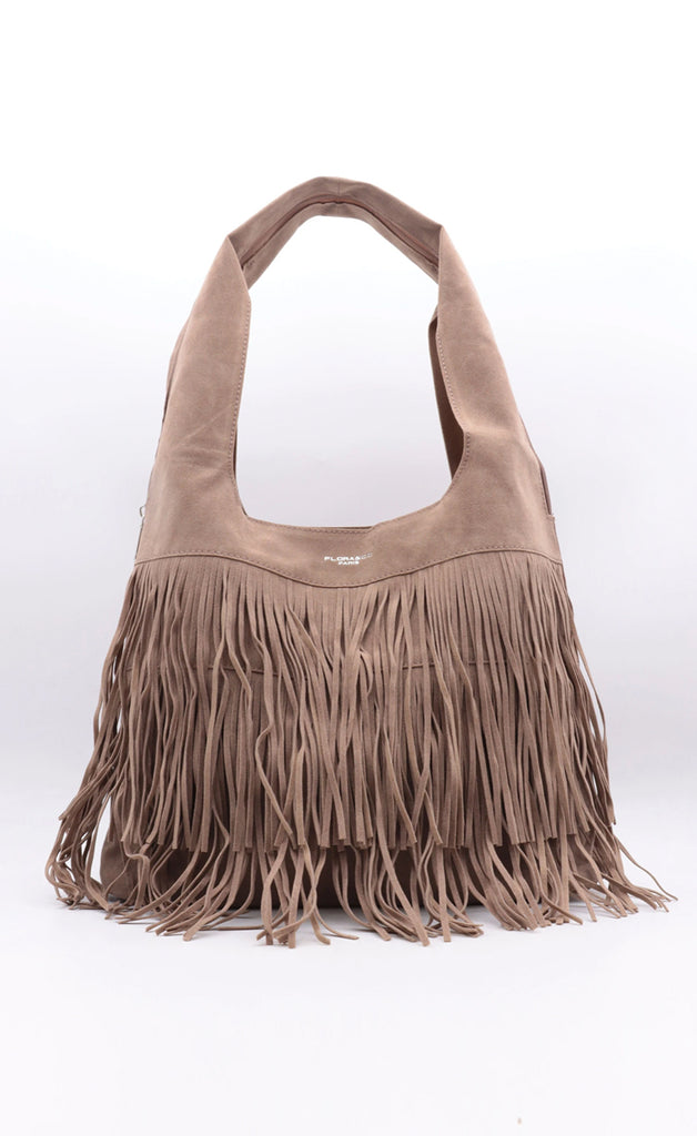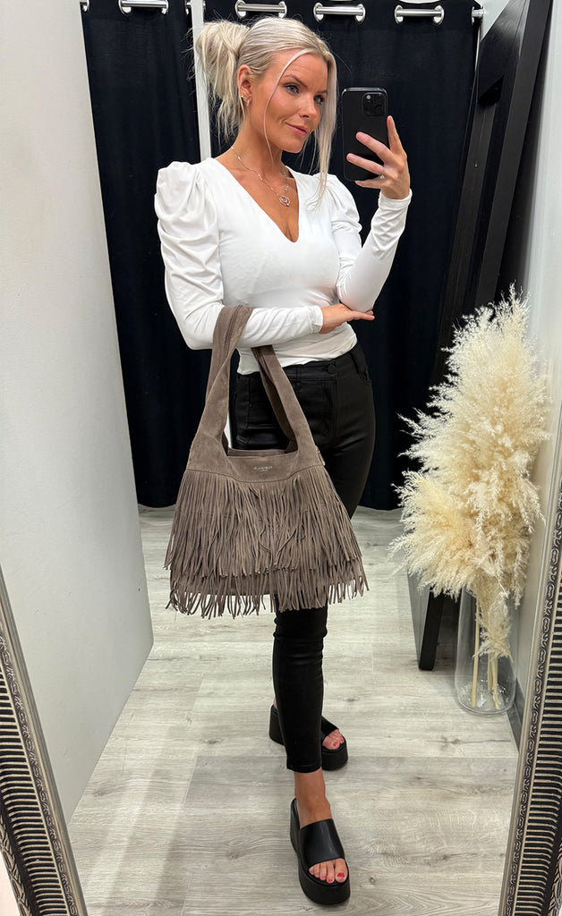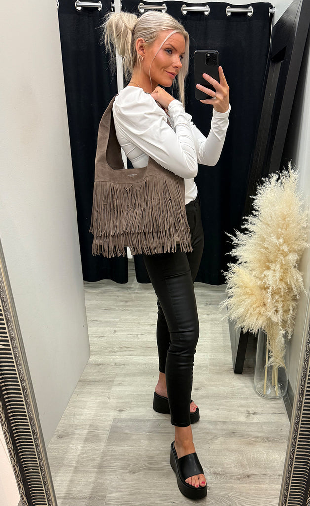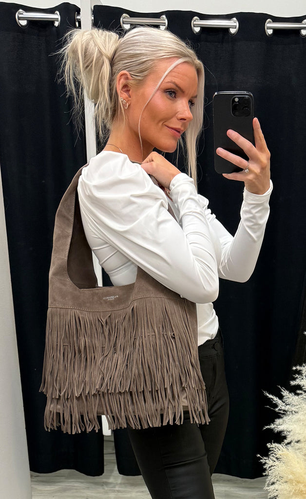 Ótrúlega falleg taska úr flottu rúskinlíki.Taskan er með einu stóru hólfi og flottu kögri að utan.
