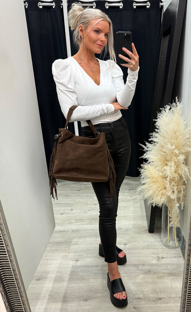Ótrúlega falleg taska úr flottu rúskinlíki.Taskan er með stóru tvískiptu hólfi og minna hólfi að aftan.-Lengri töskuól fylgir með