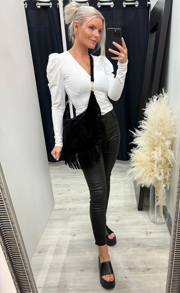Ótrúlega falleg taska úr flottu rúskinlíki. Taskan er með einu stóru hólfi, minna hólfi að aftan og flottu kögri að utan. -Töskuólina er hægt að bæði lengja og stytta