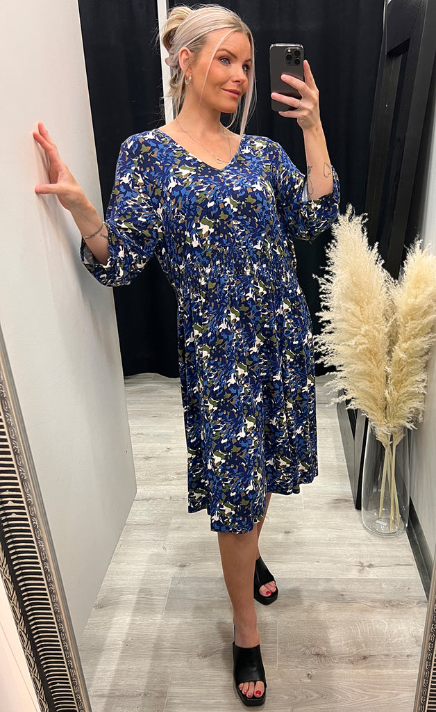 Kjóllinn er úr mjúku og teygjanlegu efni og með teygju í mittið.