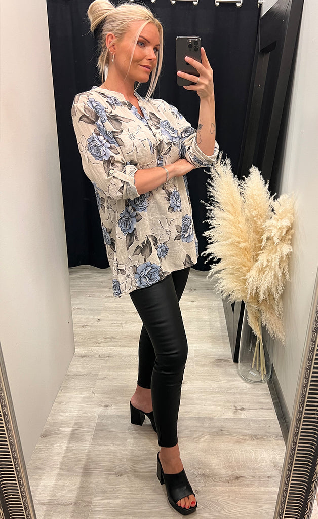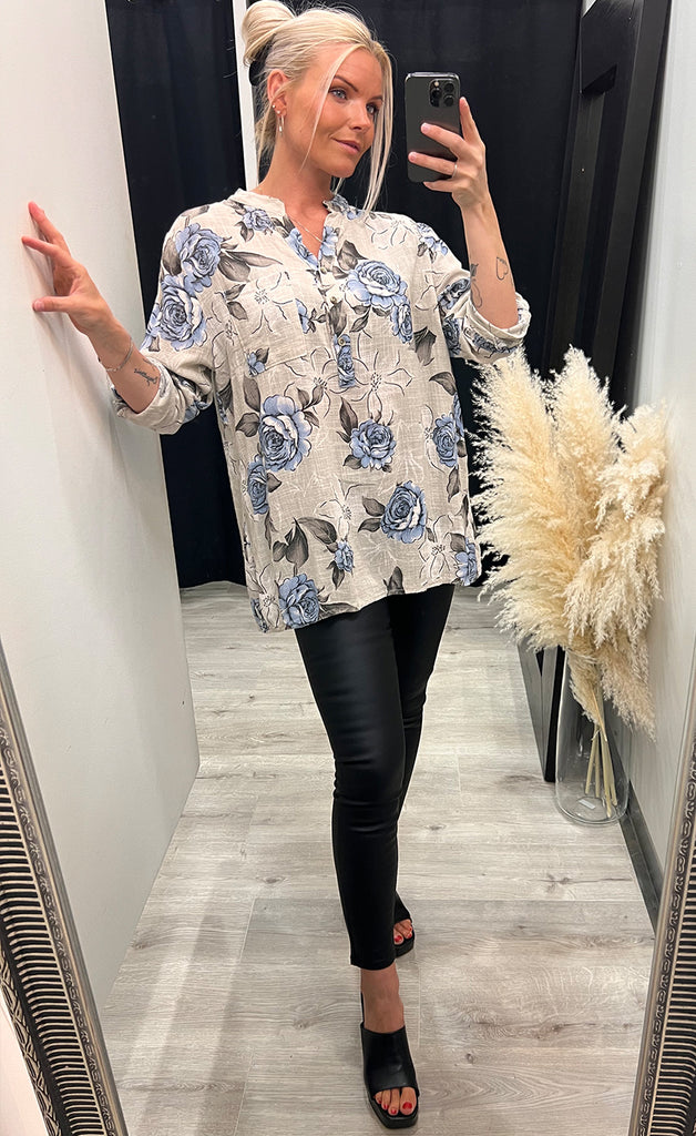 Blússan er með v-hálsmáli og hneppt að ofan og með kvartermum.