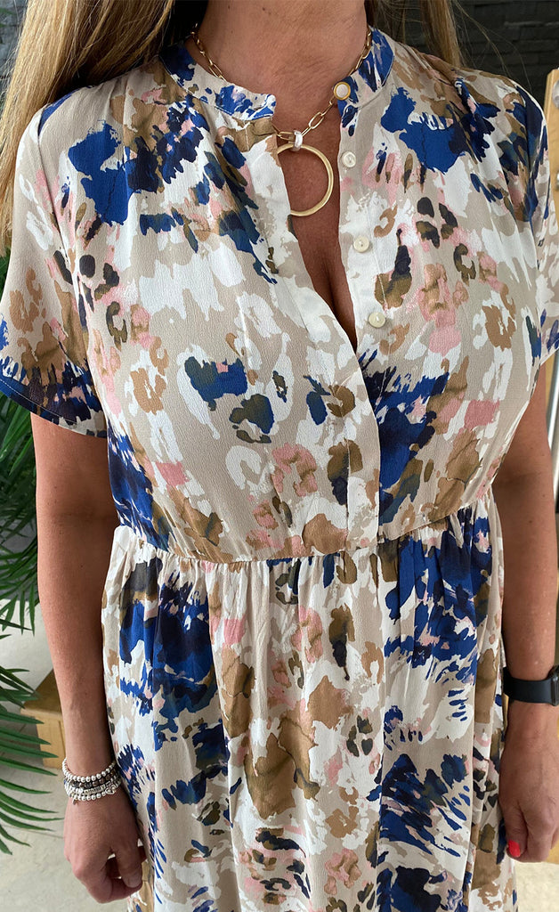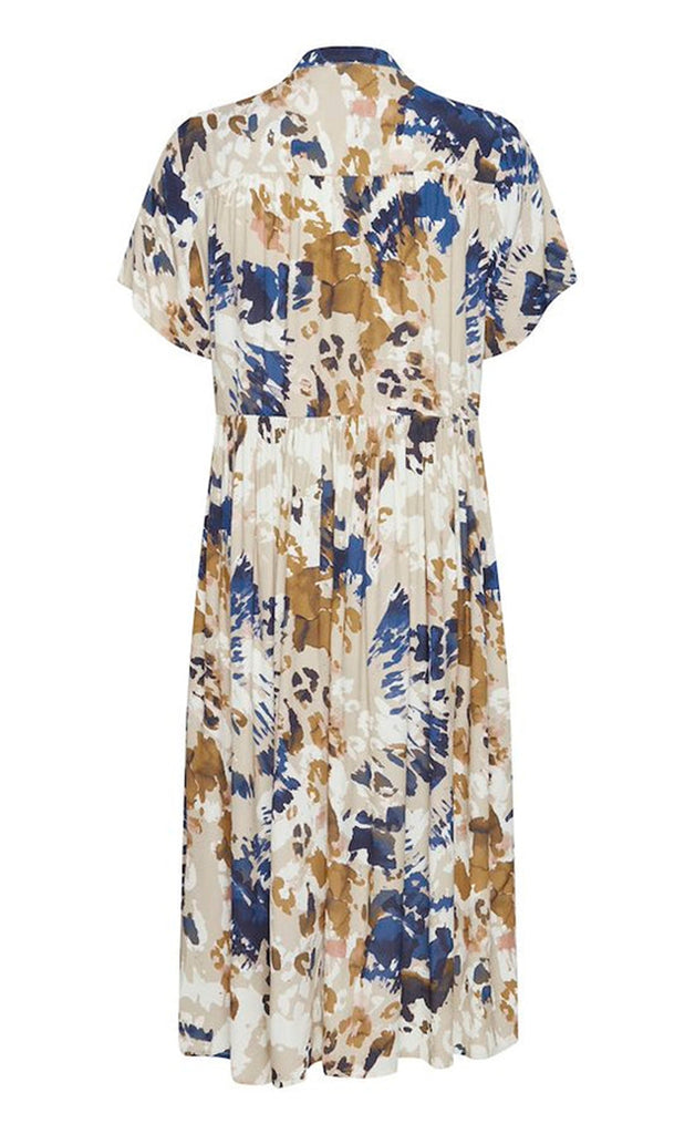 Kjóllinn er hnepptur að ofan, með vösum og með víðu pilsi.