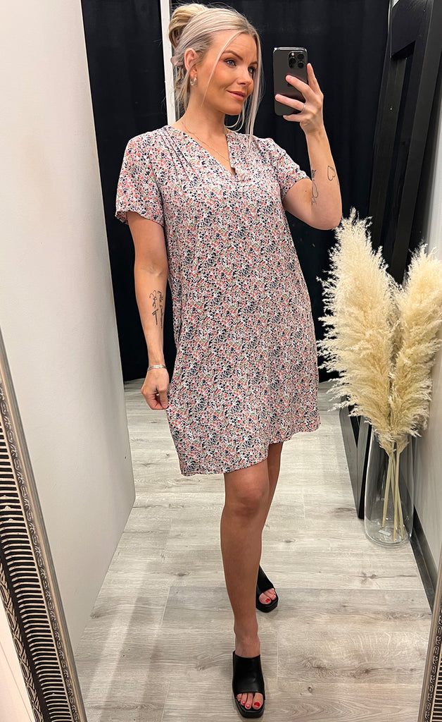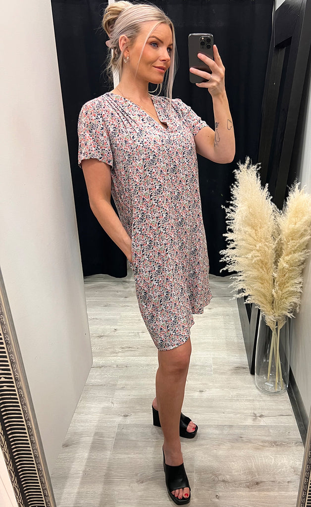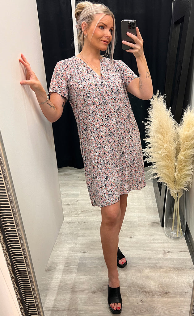 Kjóllinn er úr léttu efni, með v-hálsmáli og vösum.