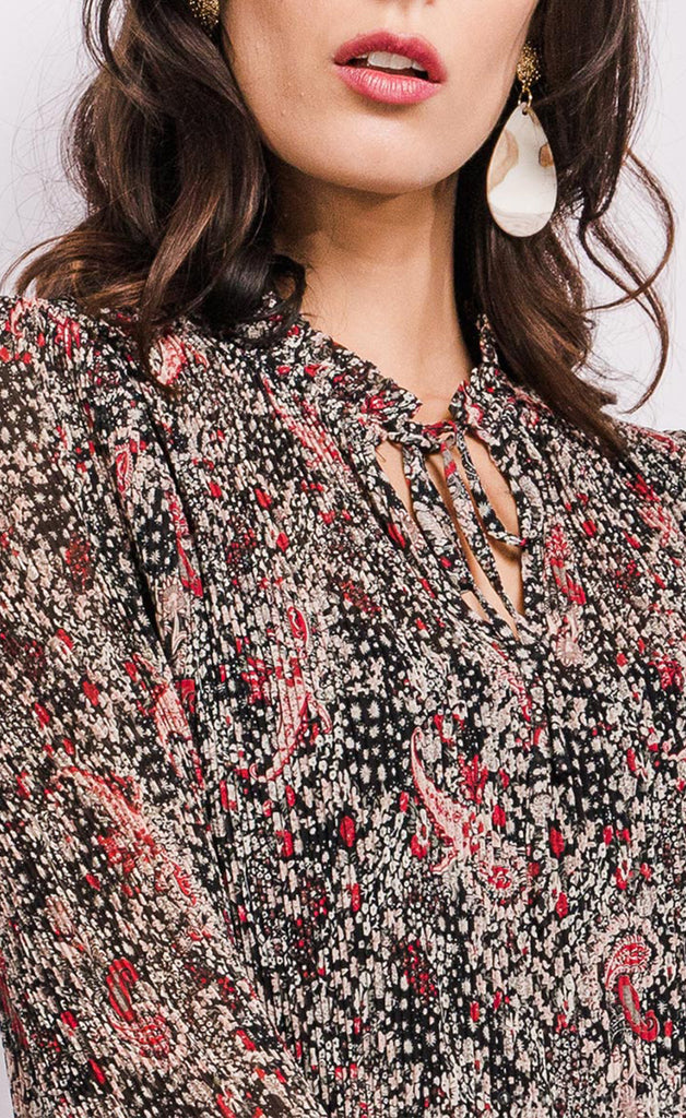 Kjóllinn er bundinn í hálsinn, laus í sniði og með teygju á ermum.