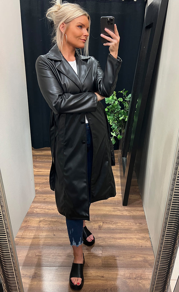 Geggjuð síð pleðurkápa með belti.