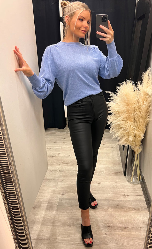 Peysan er úr mjúku og teygjanlegu efni og með rykktu detail við axlir.