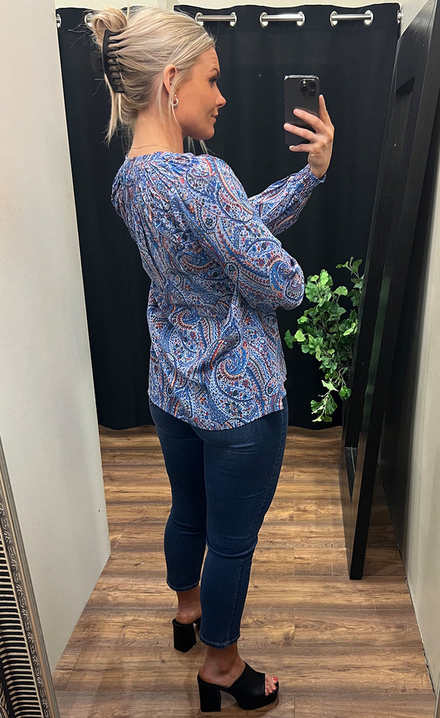Blússan er úr léttu efni, með v-hálsmáli og teygju framan á ermum.