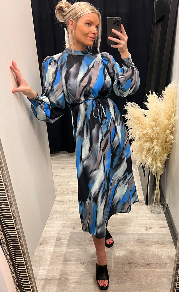 Kjóllinn er úr léttu efni, laus í sniði og með "balloon" ermum.