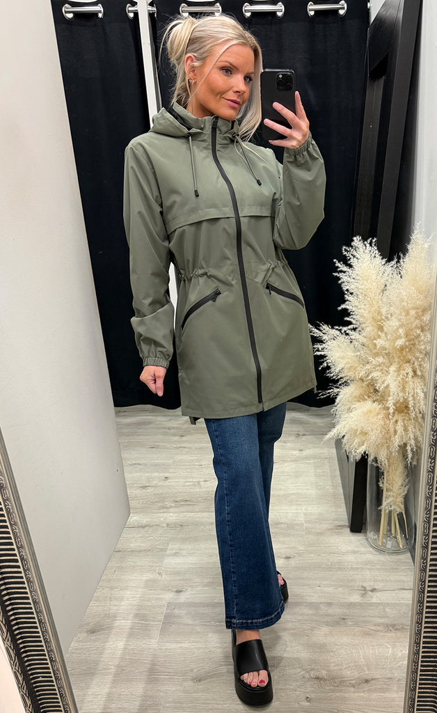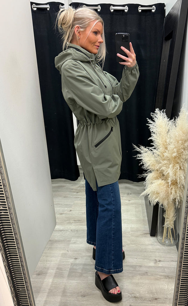 Jakkinn er úr léttu efni, renndur, með hettu og hægt að taka saman í mittið.