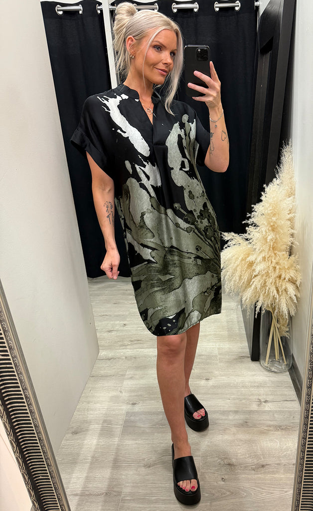Kjóllinn er úr flottu satín efni, með stuttum ermum og með vösum.