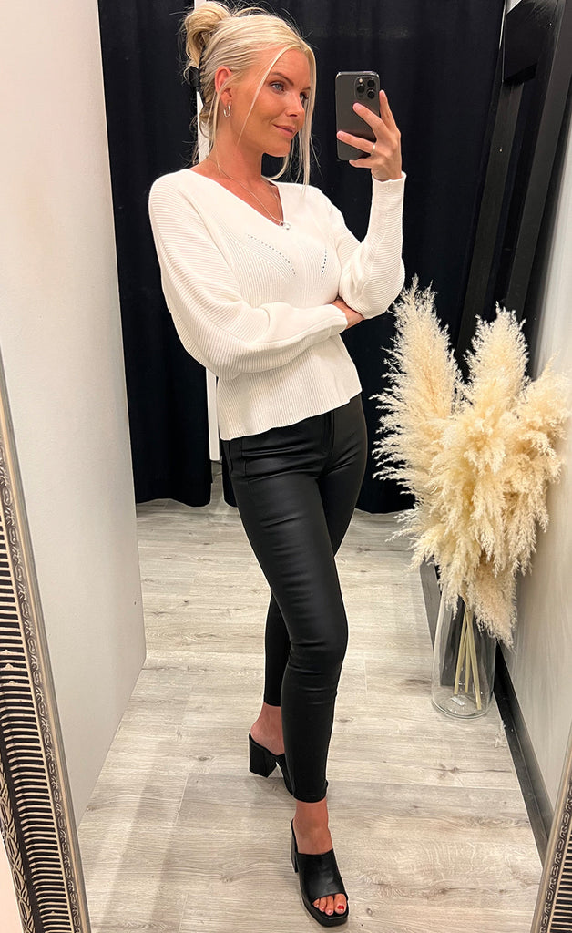 Peysn er úr mjúku og teygjanlegu prjónaefni og með v-hálsmáli.