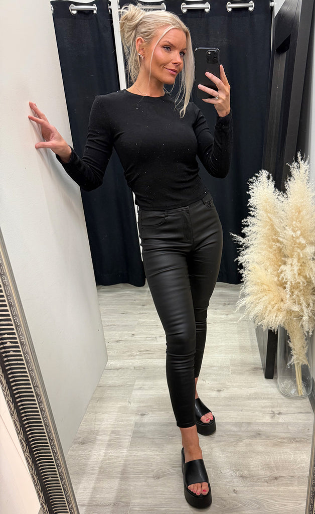 Ótrúlega falleg peysa með svörtum glitsteinum. Peysan er úr mjúku og teygjanlegu efn og rykkt í hliðum. -Módel notar stærð 36/38 og er 168 cm á hæð og er í stærð S/M