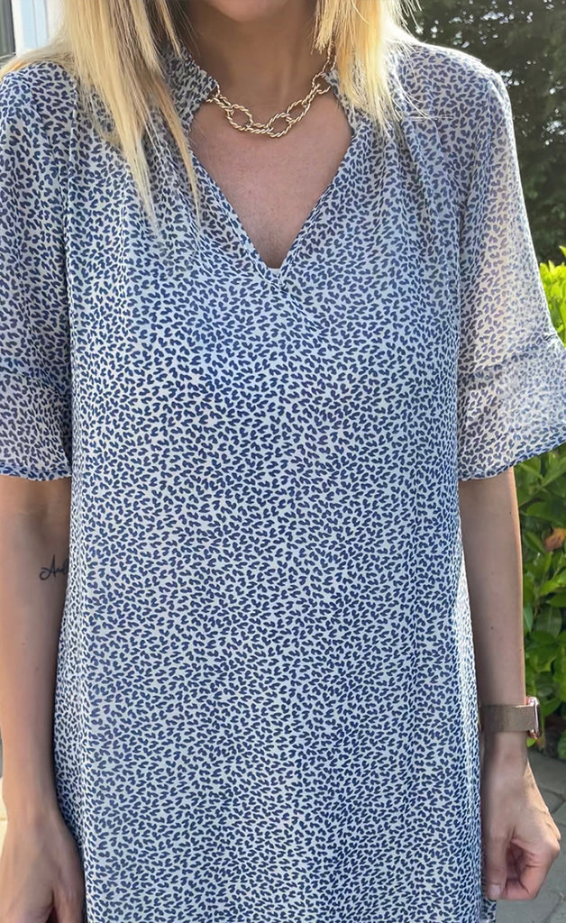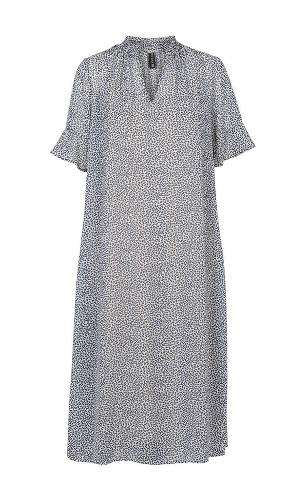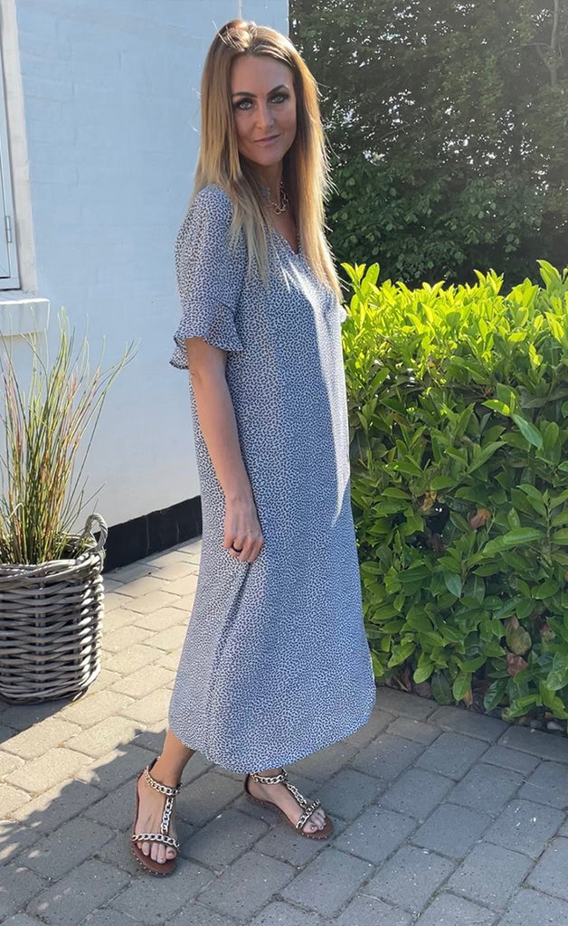 Kjóllinn er með v-hálsmáli og pífu á ermum.
