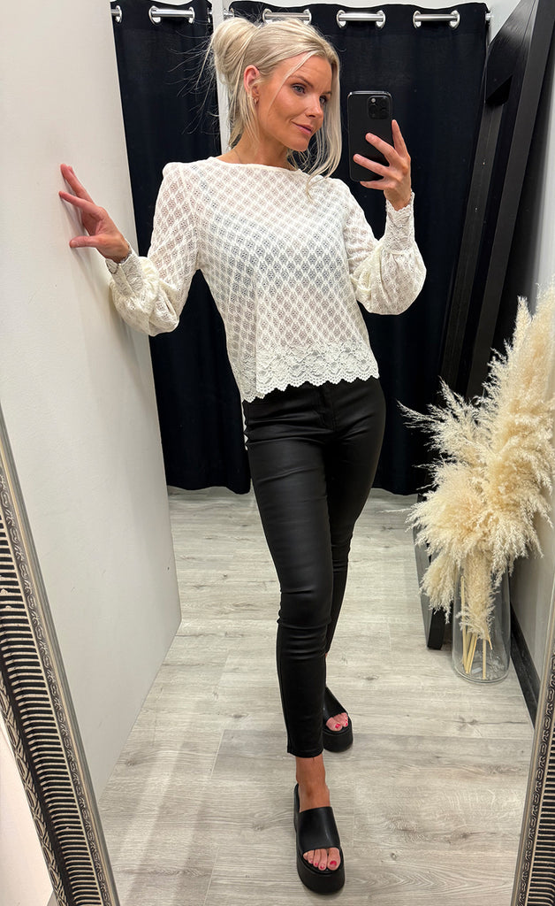 Blússan er úr mjúku og teygjanlegu efni og hneppt í bakið.