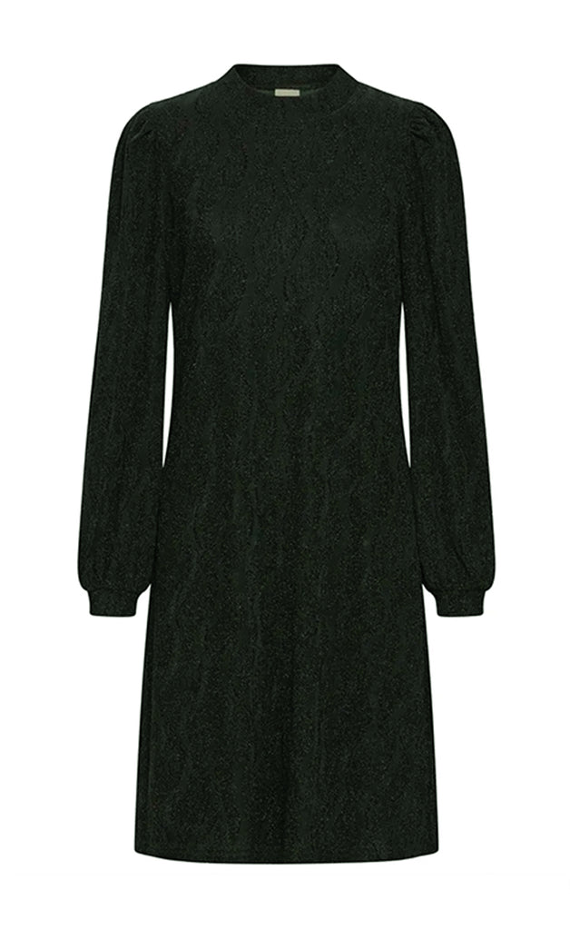 Kjóllinn er úr mjúku og teygjanlegu efni, dökk grænn í grunninn og með svörtum lurex glansþræði.
