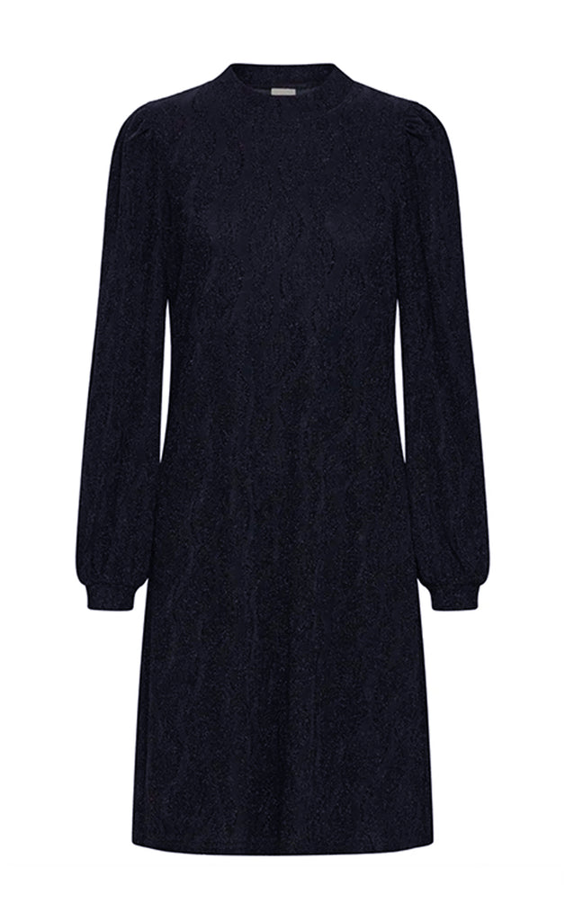Kjóllinn er úr mjúku og teygjanlegu efni, dökkblár í grunninn og með svörtum lurex glansþræði.