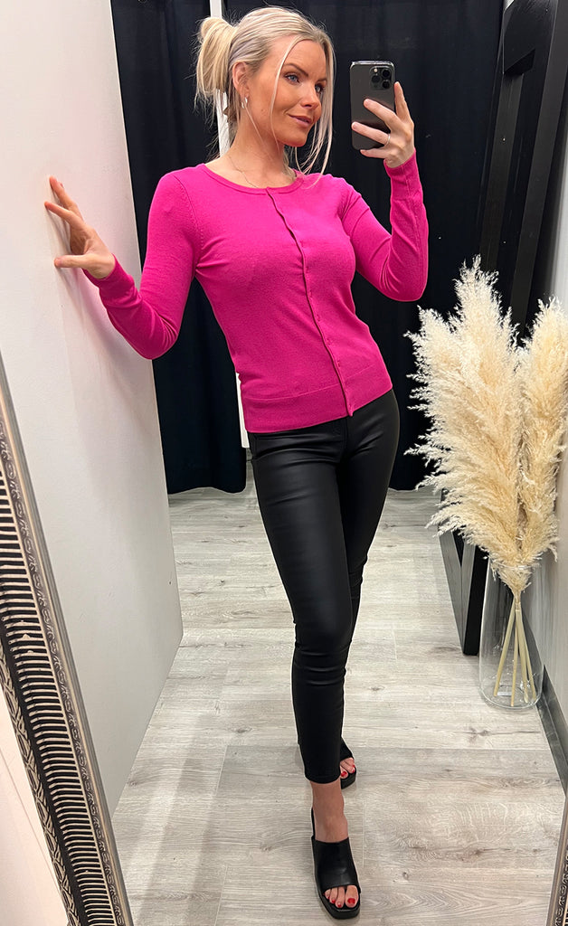Peysan er hneppt niður og úr mjúku prjónaefni.