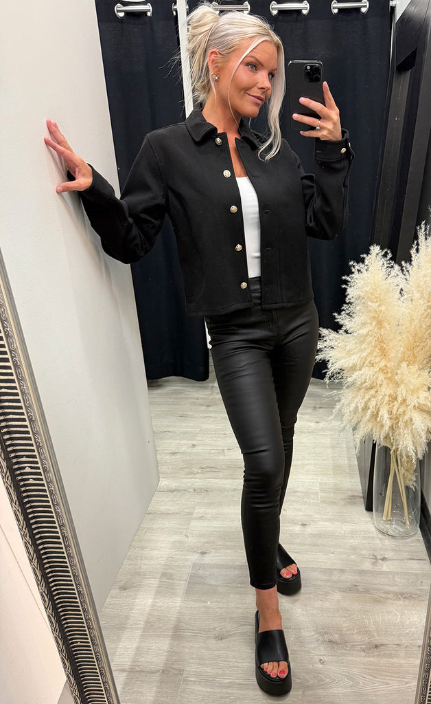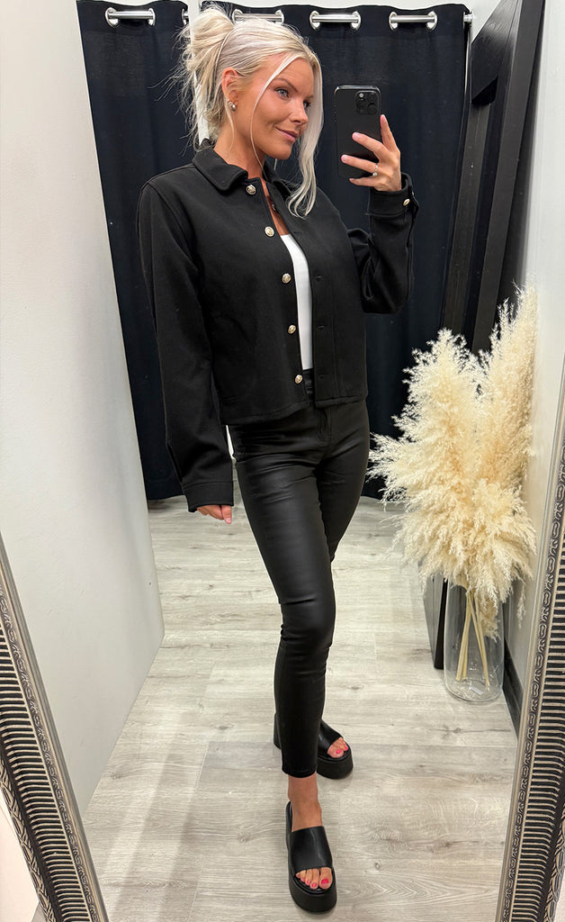 Jakkinn er úr mjúku og teygjanlegu efni, með kraga, hnepptur niður og með vösum.