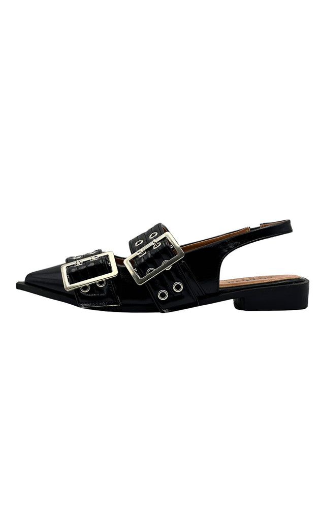 Ótrúlega flottir skór með mjórri tá, opnum hæl og silfur skraut sylgjum.