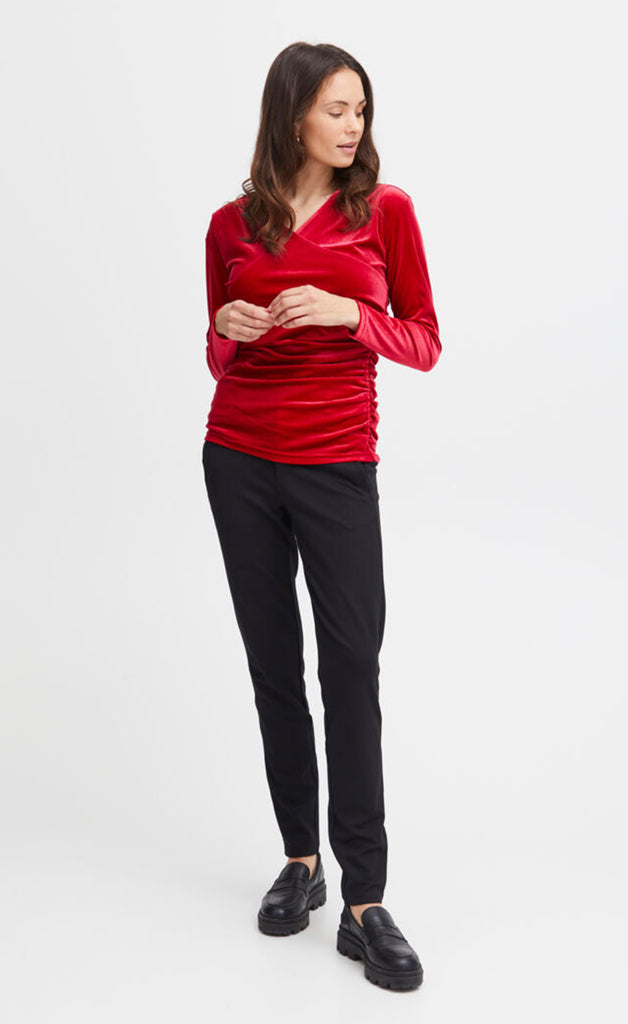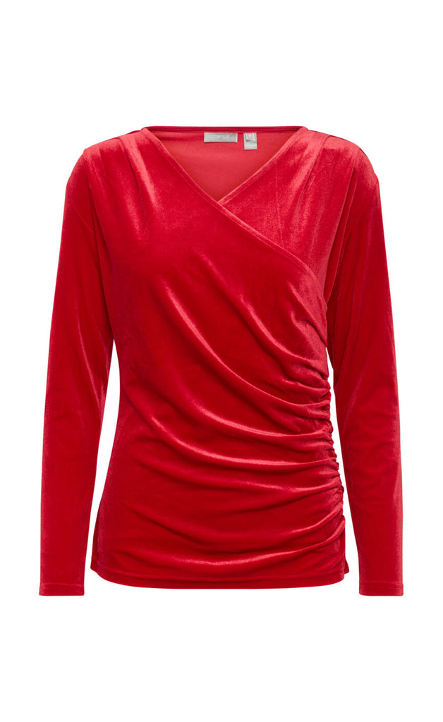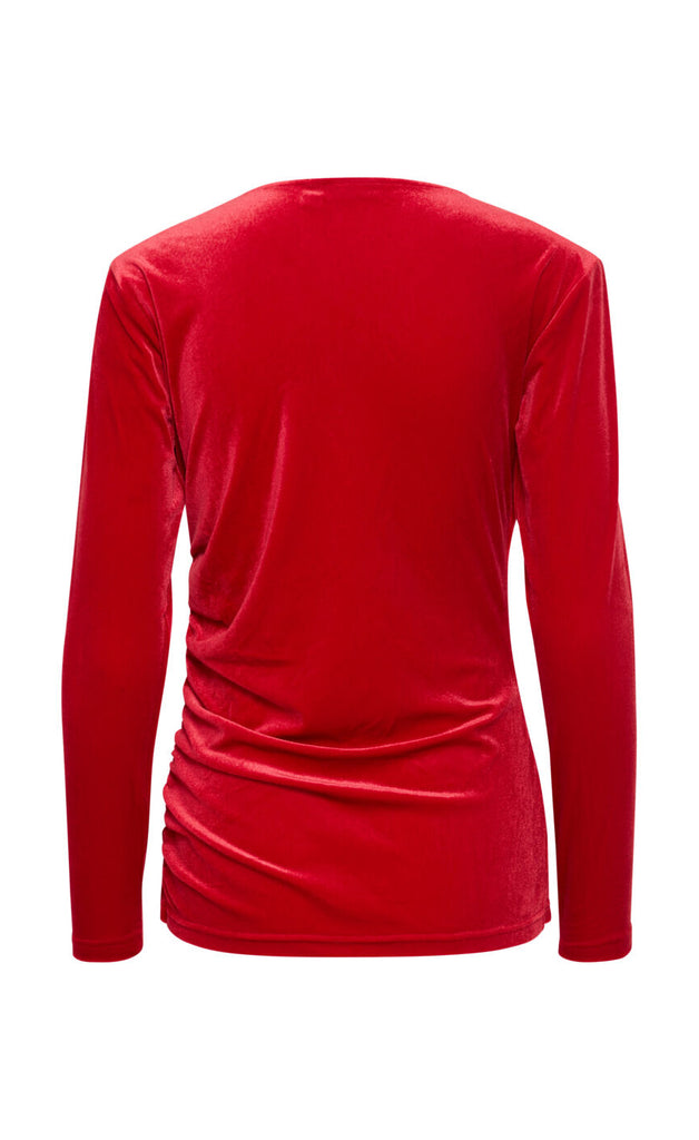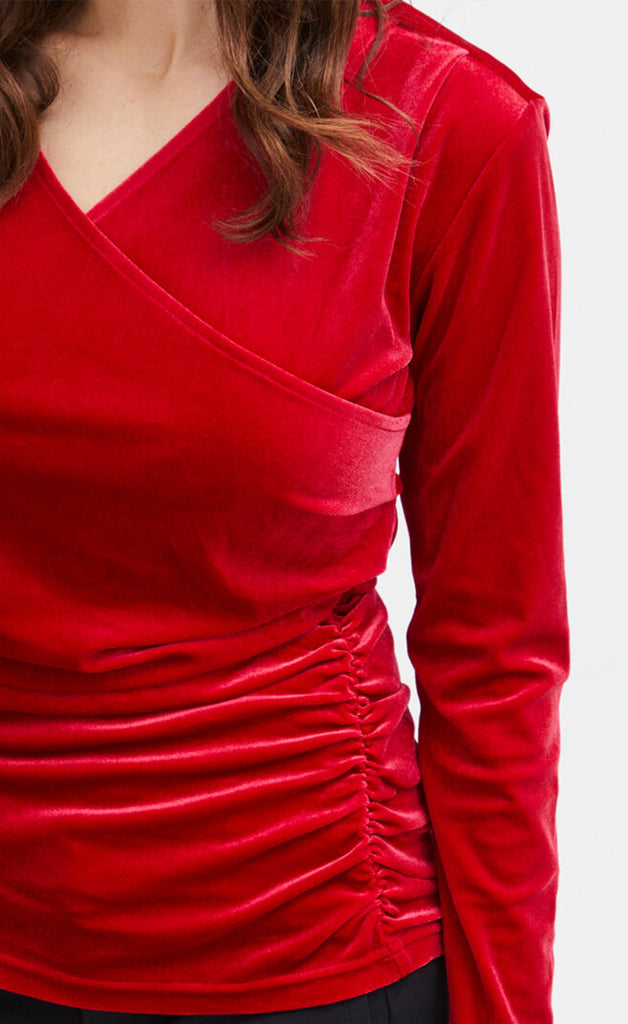 Blússan er úr mjúku og teygjanlegu velour efni og með skiptingu að framan og rykkingu í hlið.